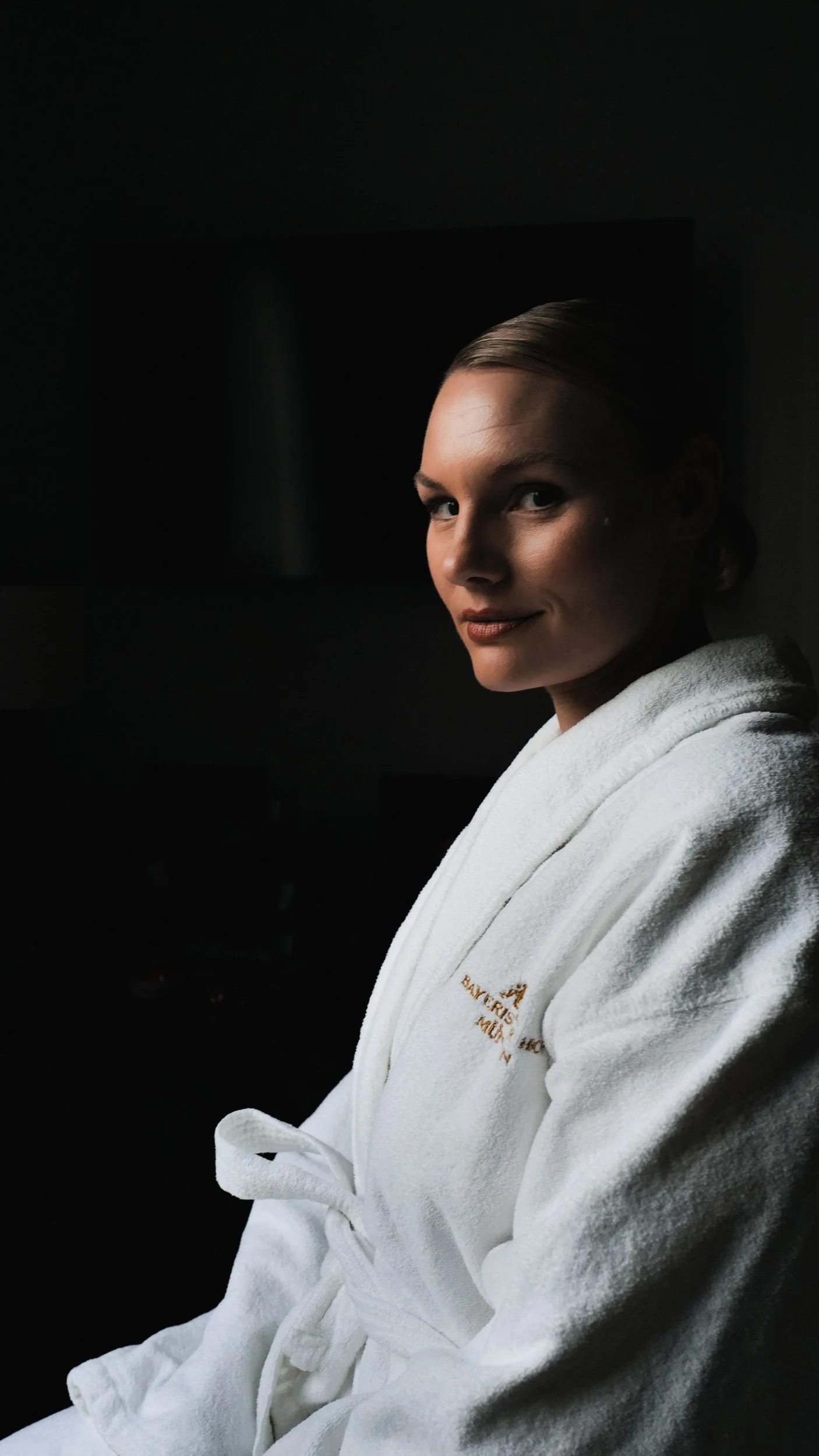 Eine lächelnde Frau sitzt an einem Flügel in einem dunklen Raum.