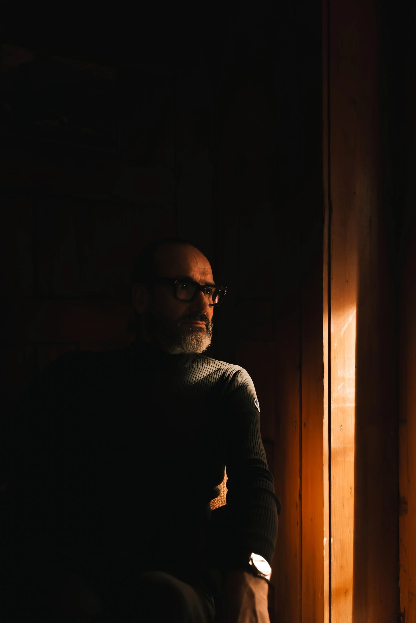 Ein Mann mit Brille in einem dunklen Raum, beleuchtet von Sonnenlicht, das durch Jalousien fällt.